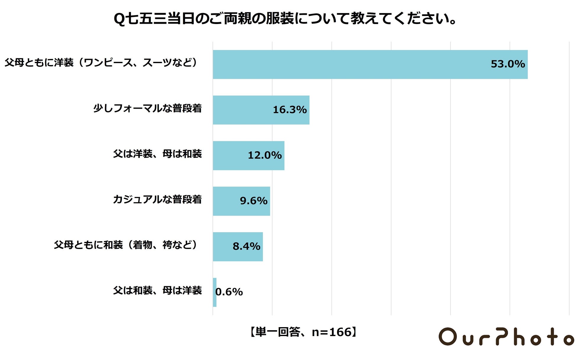 七五三当日の両親の服装について聞いたところ、「父母ともに洋装(ワンピース、スーツなど)」が53.0%と過半数以上を占め、次いで「少しフォーマルな普段着(16.3%)」、「父は洋装、母は和装(12.0%)」という結果となりました。七五三の当日には、両親が洋装を選ぶ傾向がある一方で、「父が洋装で母が和装」を選ぶケースも見受けられました。