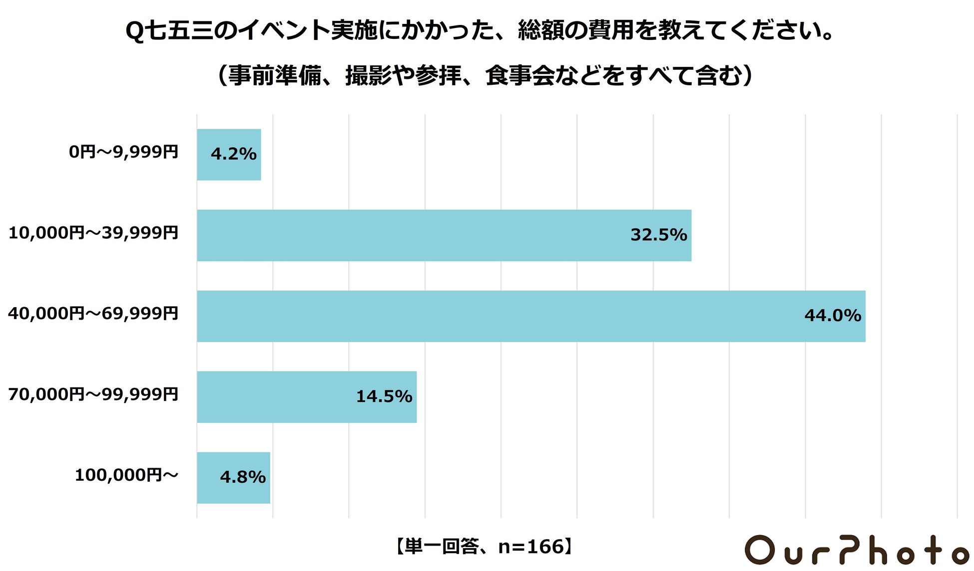 七五三イベント実施にかかった費用の総額について質問したところ、「40,000円~69,999円(44.0%)」が最も多く、次いで「10,000円~39,999円(32.5%)」、「70,000円~99,999円(14.5%)」という結果となりました。