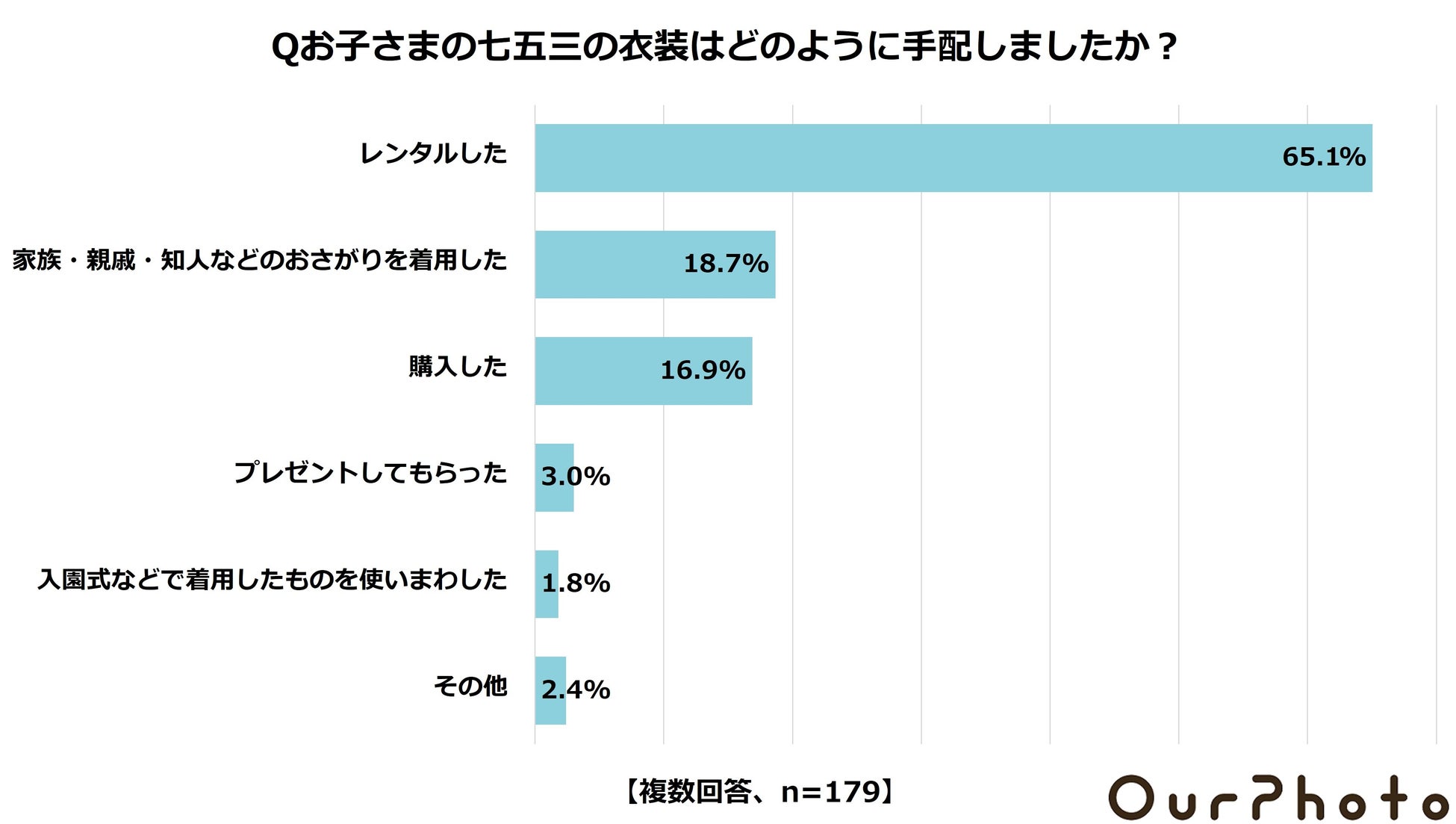 子どもの衣装の手配について聞いたところ、1位「レンタルした(65.1%)」、2位「家族・親戚・知人などのおさがりを着用した(18.7%)」、3位「購入した(16.9%)」という結果となり、6割を超える人がレンタルで手配していたことが分かりました。