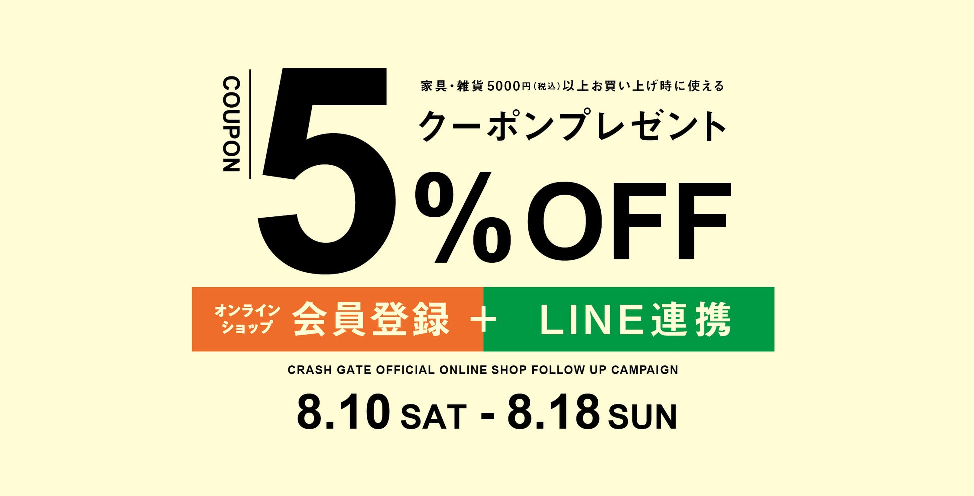 クラッシュゲート、オンラインショップ会員登録+LINEお友達登録にて5%オフクーポンをプレゼント!