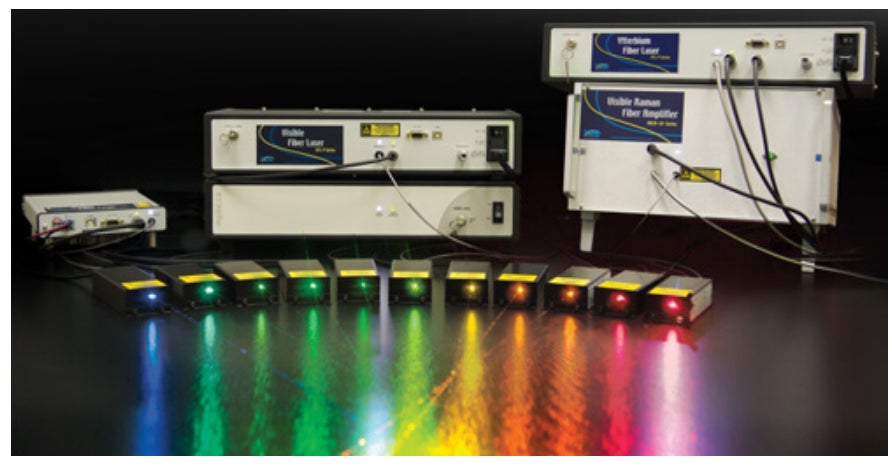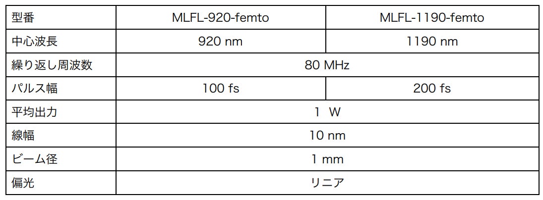 当社では同社が手掛けるレーザー関連製品の中で、波長920 nm及び1190 nm、パルス幅100 fs及び200 fs、平均出力1 W、繰り返し周波数80 MHzのフェムト秒レーザーが発振可能なモードロックフェムト秒モジュール(型番:MLFL-920/1190-femto)、構造化照明顕微鏡法、光遺伝学、量子制御等の用途に活用されている465 nm - 775 nm波長帯域で青、緑、黃・オレンジ及び赤色可視光に対応した連続波(CW)ファイバーレーザーモジュール、を中心に取り扱いを行っています。