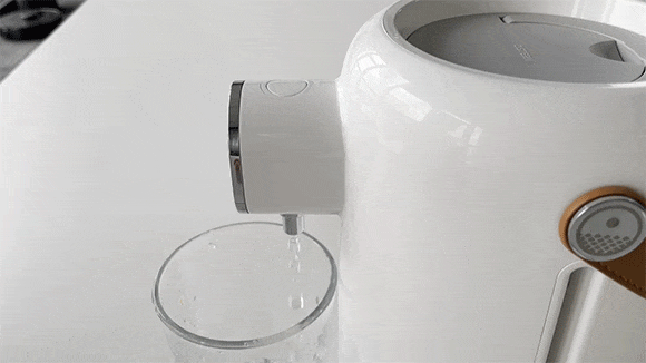 水タンクに純水・ミネラルウォーターなどの飲用水を注ぎ、給水ボタンを押すと、最高約97℃のお湯が出てきます。