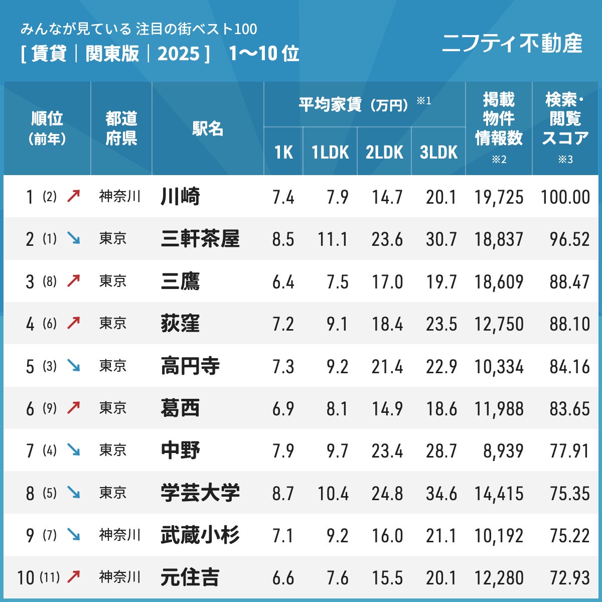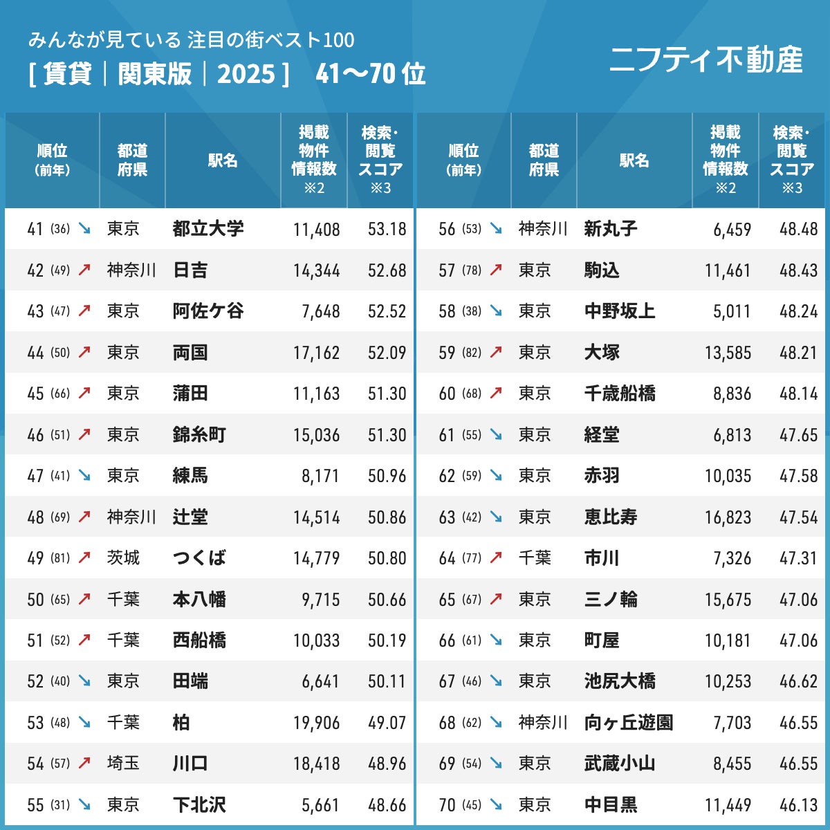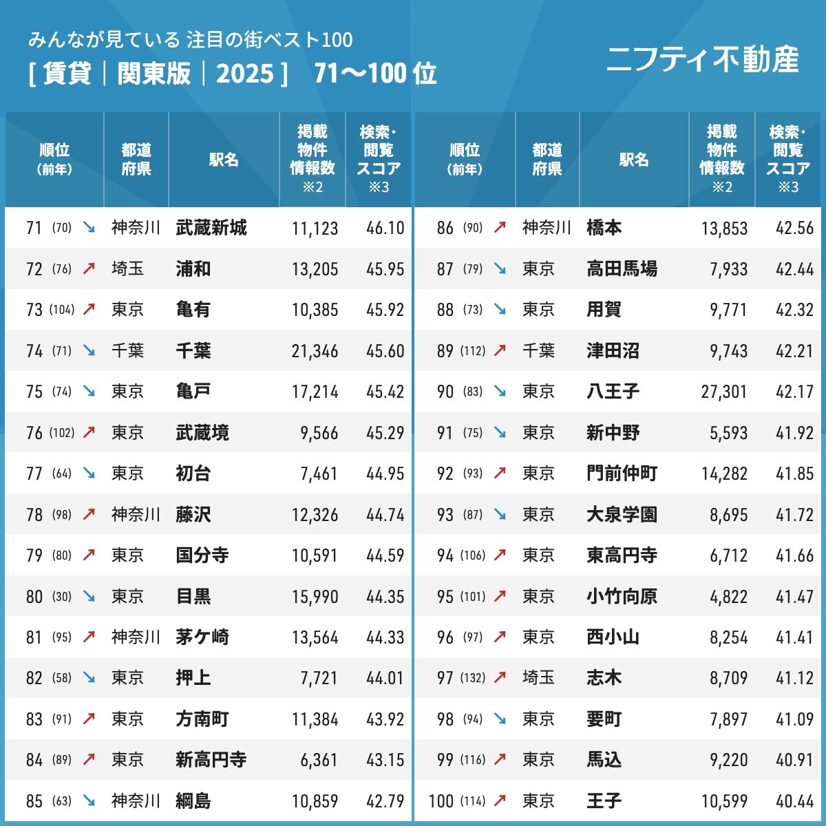 ニフティ不動産 注目の街ランキング拡大版!年間ランキング2025【関東ベスト100】発表!