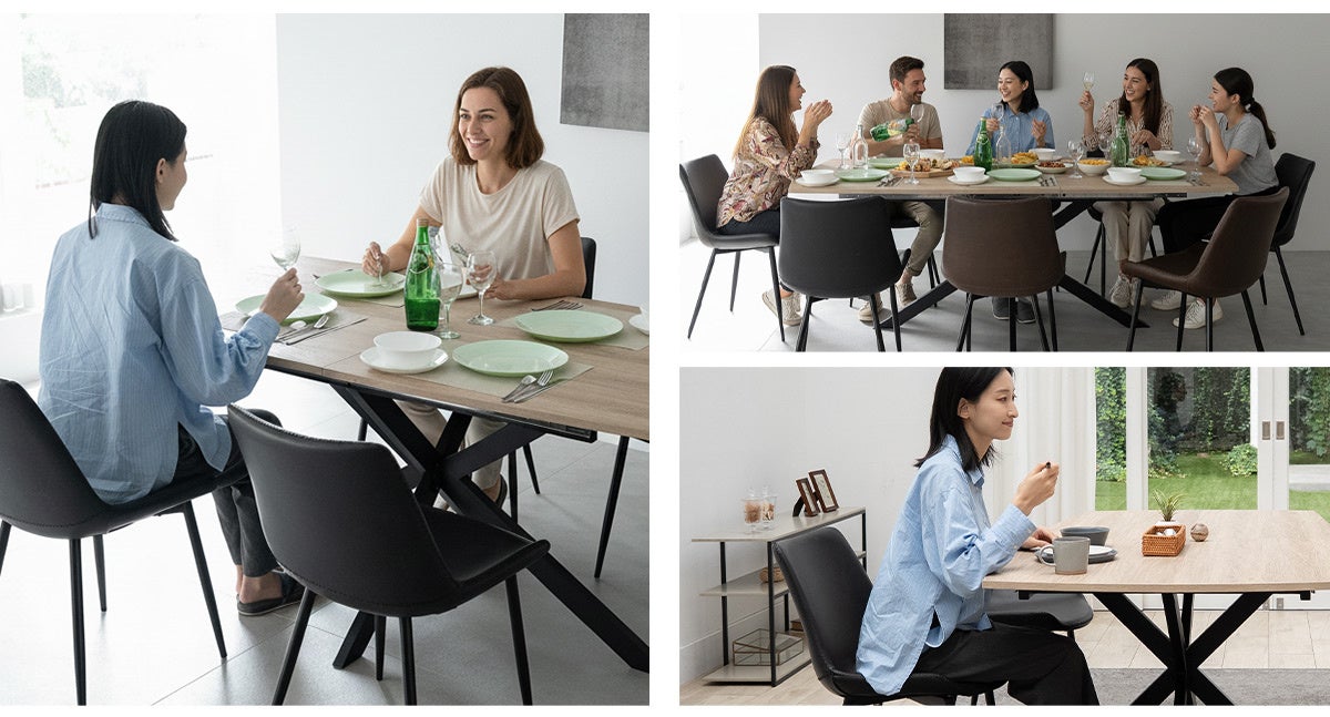 マットブラックのスチール脚が木目調の天板と調和し、ナチュラルでありながら洗練された印象を演出。クロス構造により高い安定感を実現し、椅子の配置や足元の動線を邪魔しません。どんなインテリアにも自然に溶け込むデザインです。