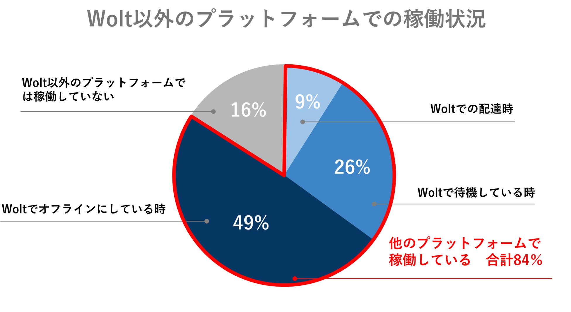 また、他のプラットフォームを使うタイミングとしては、「Woltで待機している時」が最も多く(49%)、「Woltでオフラインにしている時」(26%)、「Woltで配達している時」(9%)が続きました。