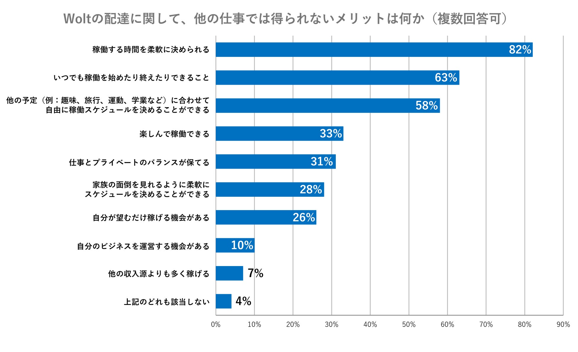 Woltの配達に関して、他の仕事では得られないメリットとしてどのようなものがあると思うかを聞いたところ、「稼働する時間を柔軟に決められる」が82%と最も多く、「いつでも稼働を始めたり終えたりできる」(63%)「他の予定(例:趣味、旅行、運動、学業など)に合わせて自由に稼働スケジュールを決めることができる」(58%)と続きました。このことから、配達パートナーは柔軟な働き方ができることを大きなメリットと考えていることがわかりました。