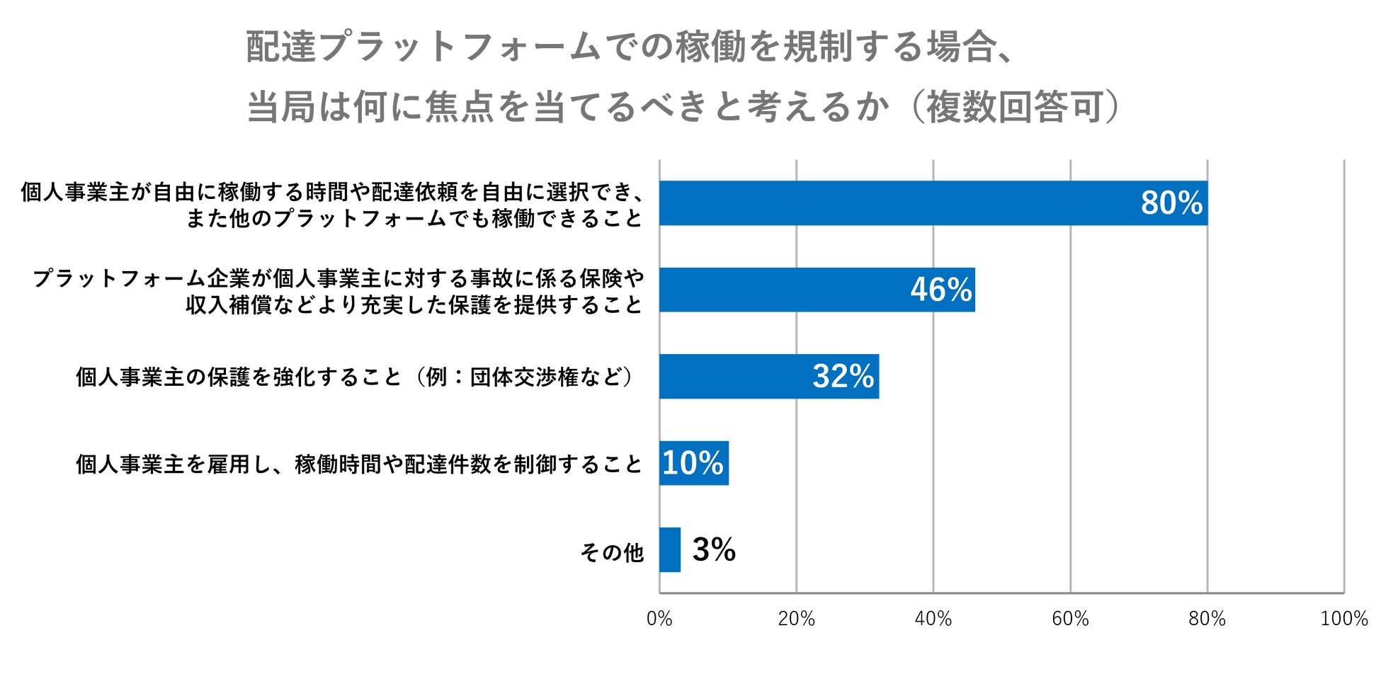 次に当局がプラットフォームへの規制を行う場合に何に焦点を当てるべきを考えるかを聞いたところ、「個人事業主が自由に稼働する時間や配達依頼を自由に選択でき、また他のプラットフォームでも稼働できること」が80%と最も多い回答を得ました。