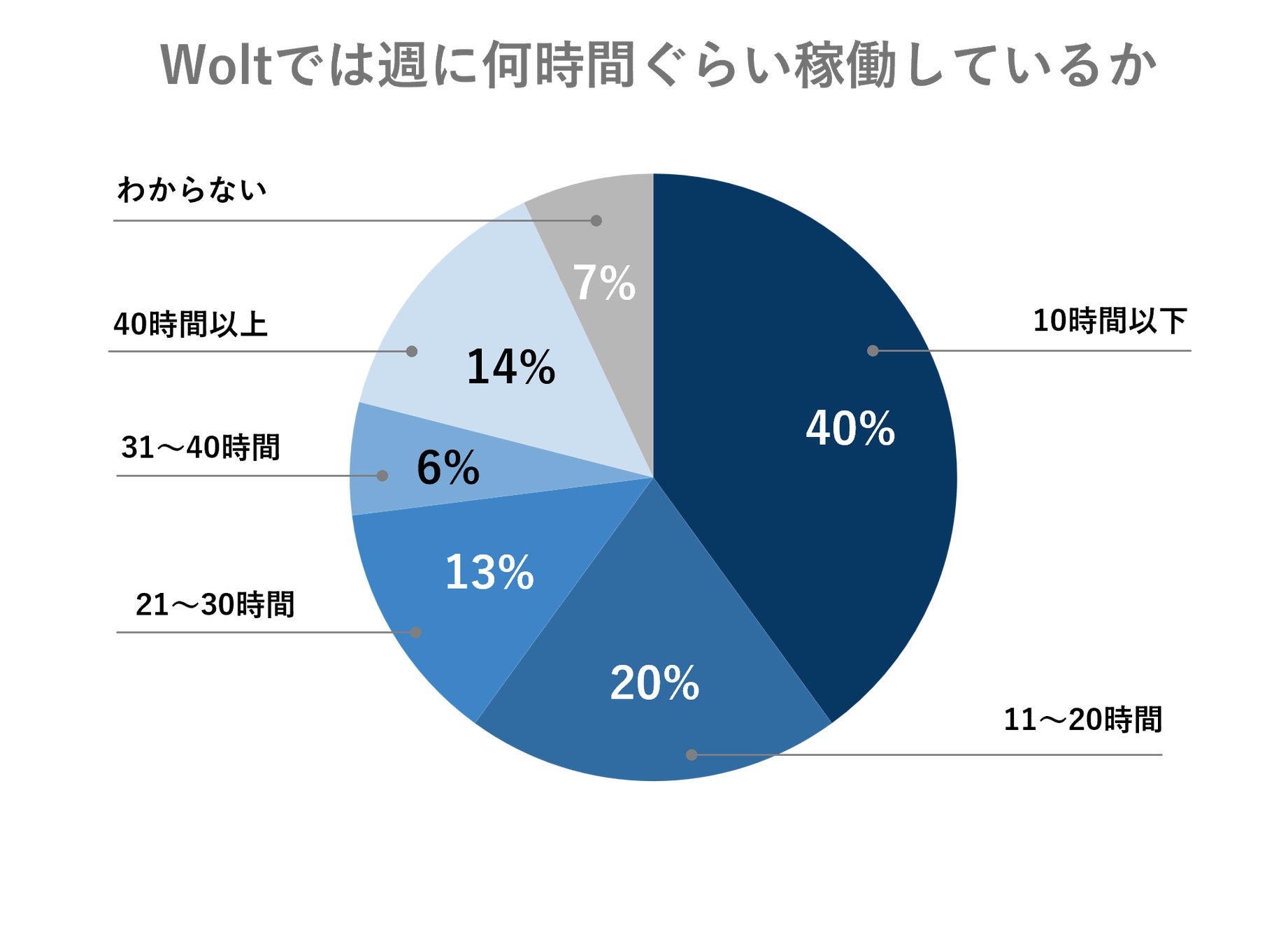 このほか、1週間のWoltでの平均的な稼働時間を聞いたところ、「10時間以下」が40%と最も多く、「11〜20時間」が20%、「21〜30時間」が13%と続きました。