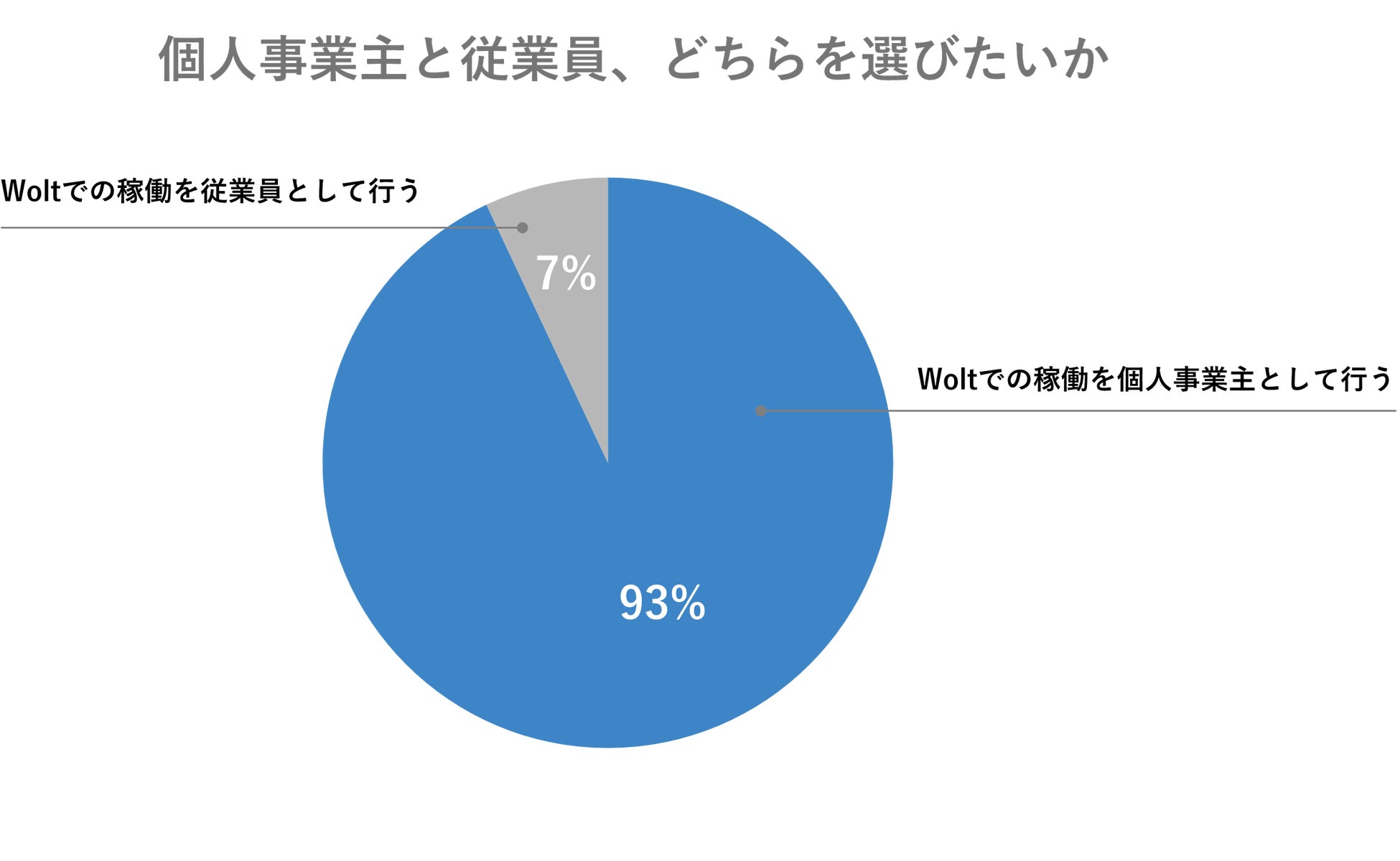 従業員として働くことと個人事業主として働くことの違いについての理解を聞いたところ、違いを「理解している」と答えた割合が93%に上り、「理解していない」の7%を大きく上回りました。また個人事業主としての稼働と従業員としての稼働のどちらを望むかを聞いたところ、「個人事業主としての稼働」が93%と「従業員としての稼働」の7%を大きく上回りました。この結果から、個人事業主としての働き方を望んでいる人が大多数を占めていることがわかります。