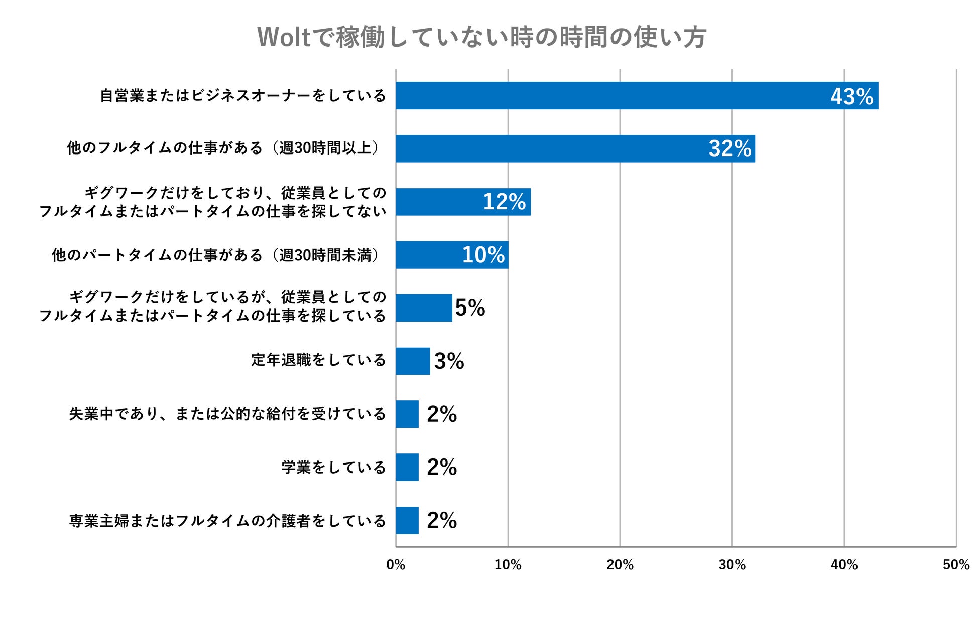 次にWoltで稼働していない時の時間の使い方について聞いたところ、「自営業またはビジネスオーナーをしている」が43%と最も多く、「他のフルタイムの仕事がある」(32%) が続きました。「ギグワークだけをしており、従業員としてのフルタイムまたはパートタイムの仕事を探してない」「ギグワークだけをしているが、従業員としてのフルタイムまたはパートタイムの仕事を探している」と答えた割合はそれぞれ12%と5%でした。この結果から、配達パートナーの多くは他の仕事と掛け持ちをしていることが伺えます。