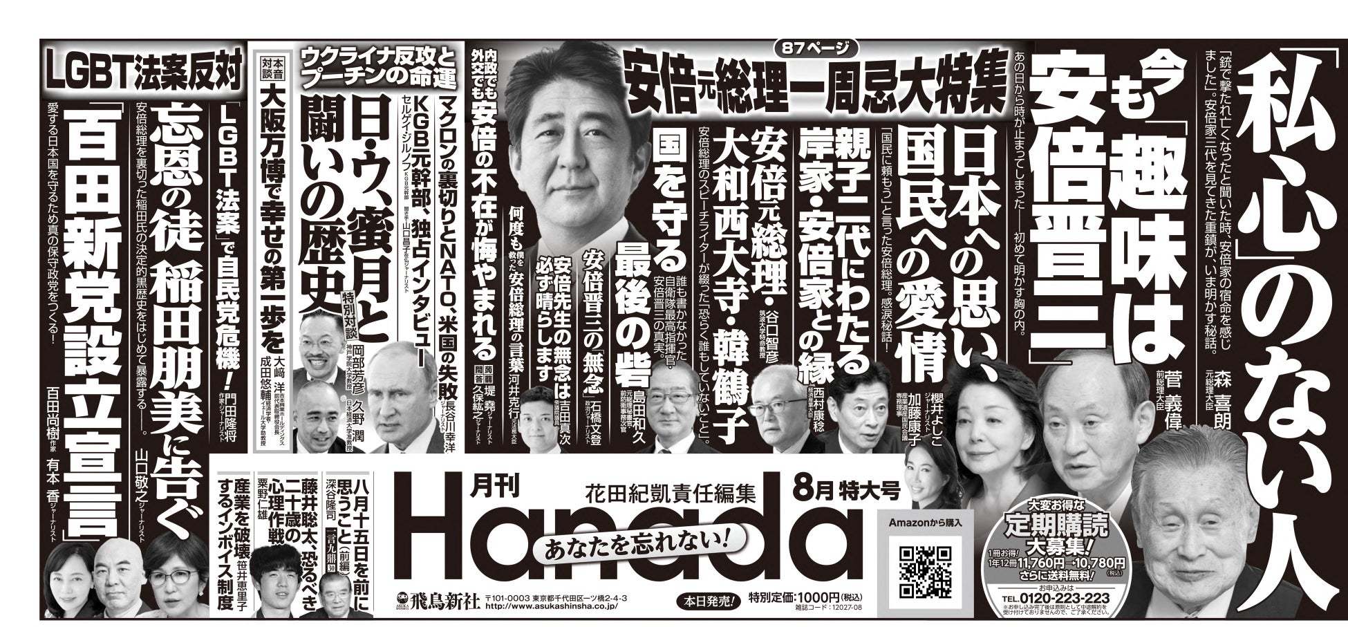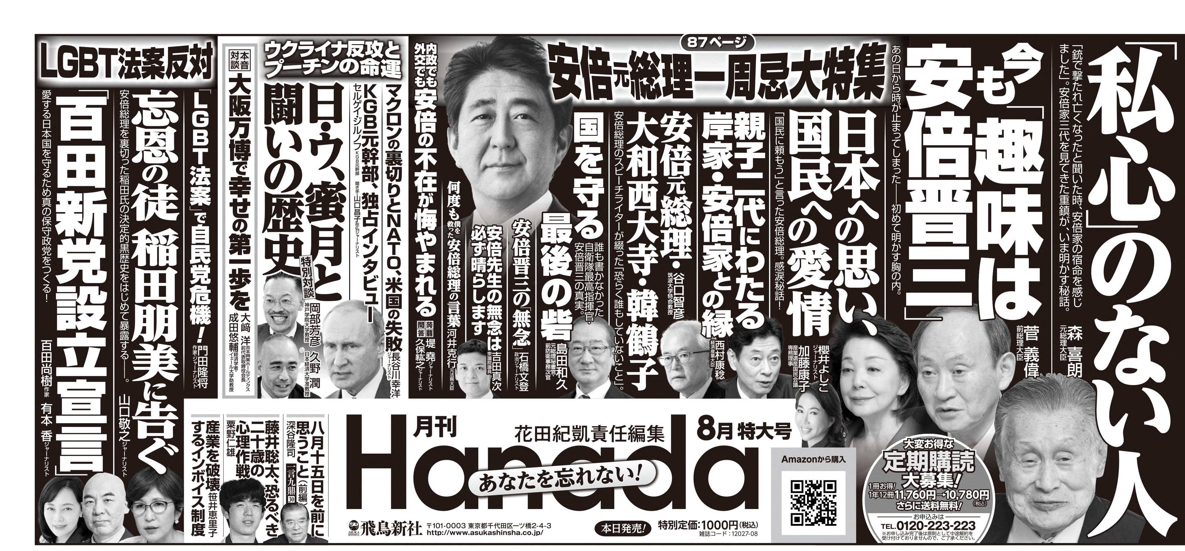 6月26日発売の月刊『Hanada』8月号(飛鳥新社)において、森喜朗元総理と菅義偉前総理が安倍元総理一周忌を前に想いを寄稿した。
