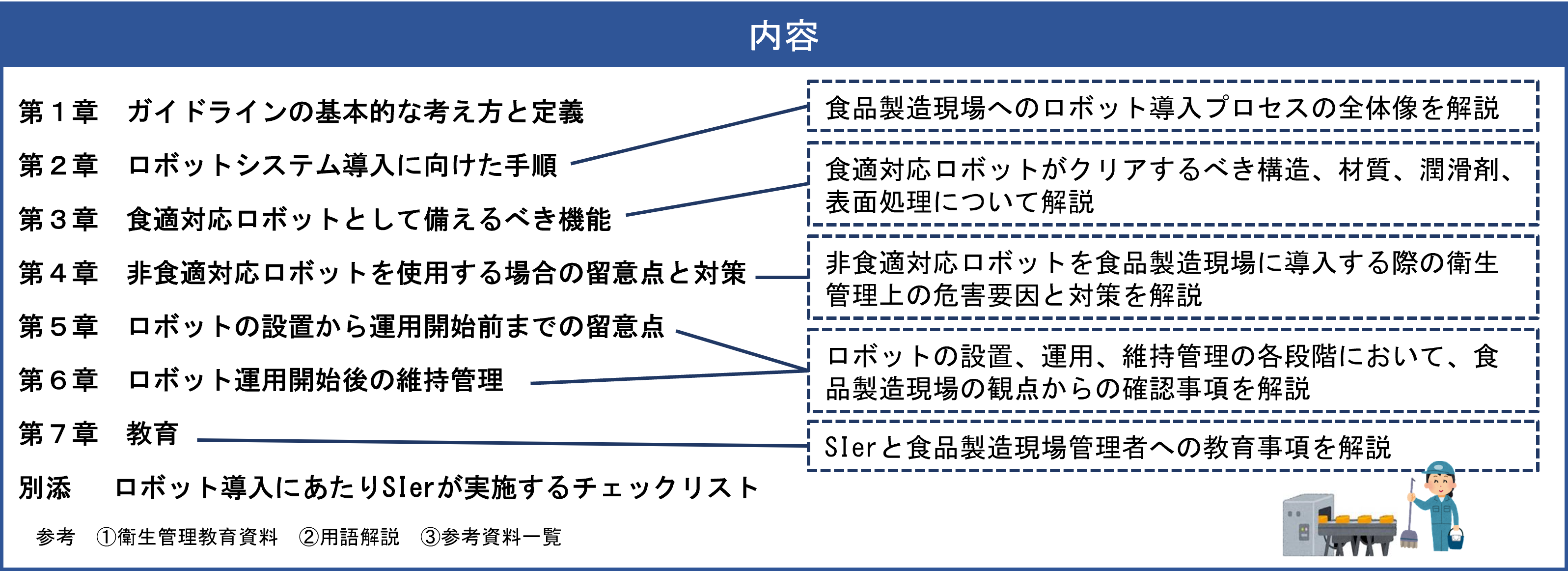 本ガイドラインは、工場にロボット等を導入しようとしている食品製造事業者や、食品分野に参入しようとしている機械メーカー、SIerに役立てていただける内容となっています。