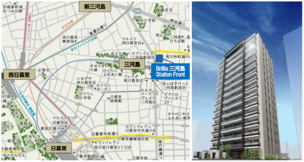 【「Brillia 三河島 Station Front」位置図と完成予想図】