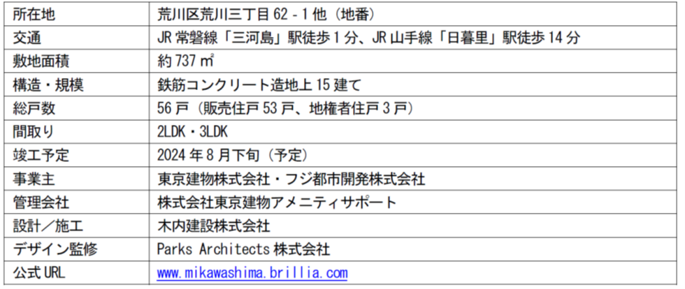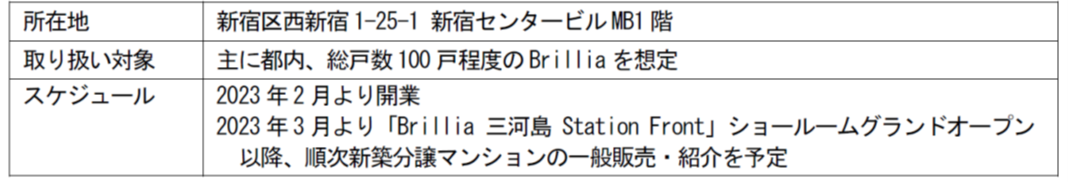 今後は、JR常磐線「三河島」駅徒歩1分の好立地に所在する「Brillia 三河島 Station Front」(本年3月ショールームグランドオープン)以降、都内で開発する総戸数100戸程度までの新築分譲マンション「Brillia」の一般販売・紹介を継続して行います。