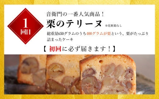 なんと初回には一番人気商品の「栗のテリーヌ」が必ず届きます。2回目以降は、音衛門のオススメの季節のパウンドケーキをお届けします。季節のパウンドケーキはふるさと納税では【お楽しみ定期便】でしか手に入りません。どんな味が届くかは開けてからのお楽しみです。