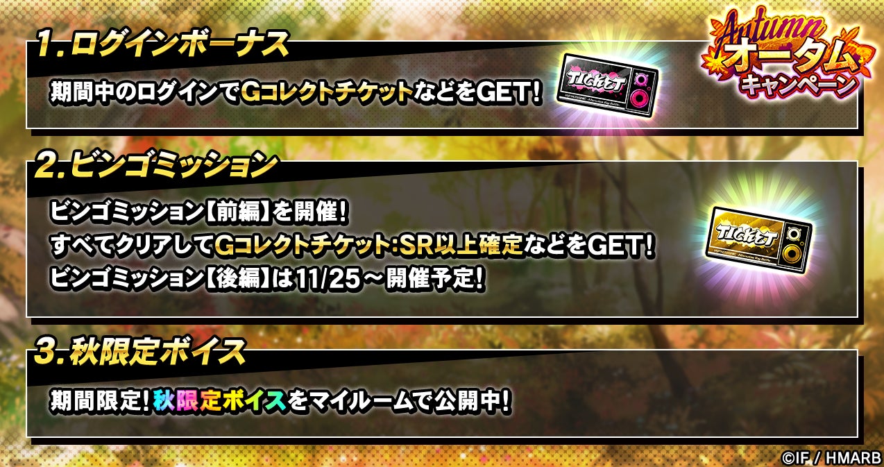 期間中、すべてのミッションをクリアすると「Gコレクトチケット:SR以上確定」を獲得できるビンゴミッションのほか、ログインボーナスなどを開催しています。