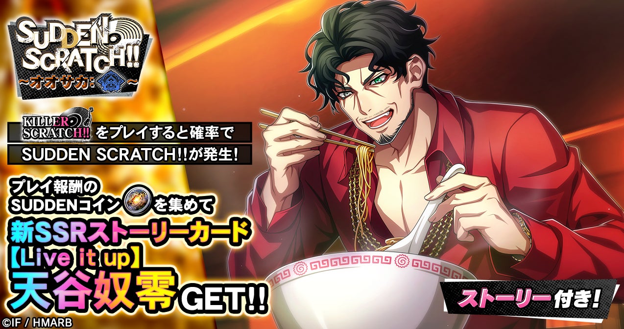 イベント期間中、KILLER SCRATCH!!をプレイするとライズ消費量に応じた確率でSUDDEN SCRATCH!!が発生します。SUDDEN SCRATCH!!をプレイすると、通常の報酬アイテムの他、限定アイテム「SUDDENコイン」を獲得することができます。「SUDDENコイン」を集めることで、ストーリーカード「SSR【Live it up】天谷奴零」と交換することが可能です。