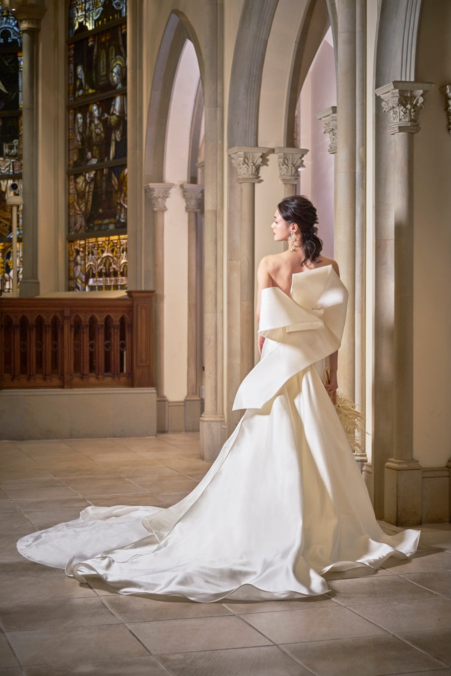 ボリュームある後ろ姿の対比と構築的なリボンレーンがあしなわれたドレスや、ベスト-アニバーサリーオリジナルエクスクルーシブモデルも登場、肌に優しくなじむブラウンにブラックカラーのウエストシェイプが期待できるサッシュベルトもポイントに。カラードレス迷子になっている花嫁にお勧めしたいドレスラインナップも期間限定でお目見えいたします。