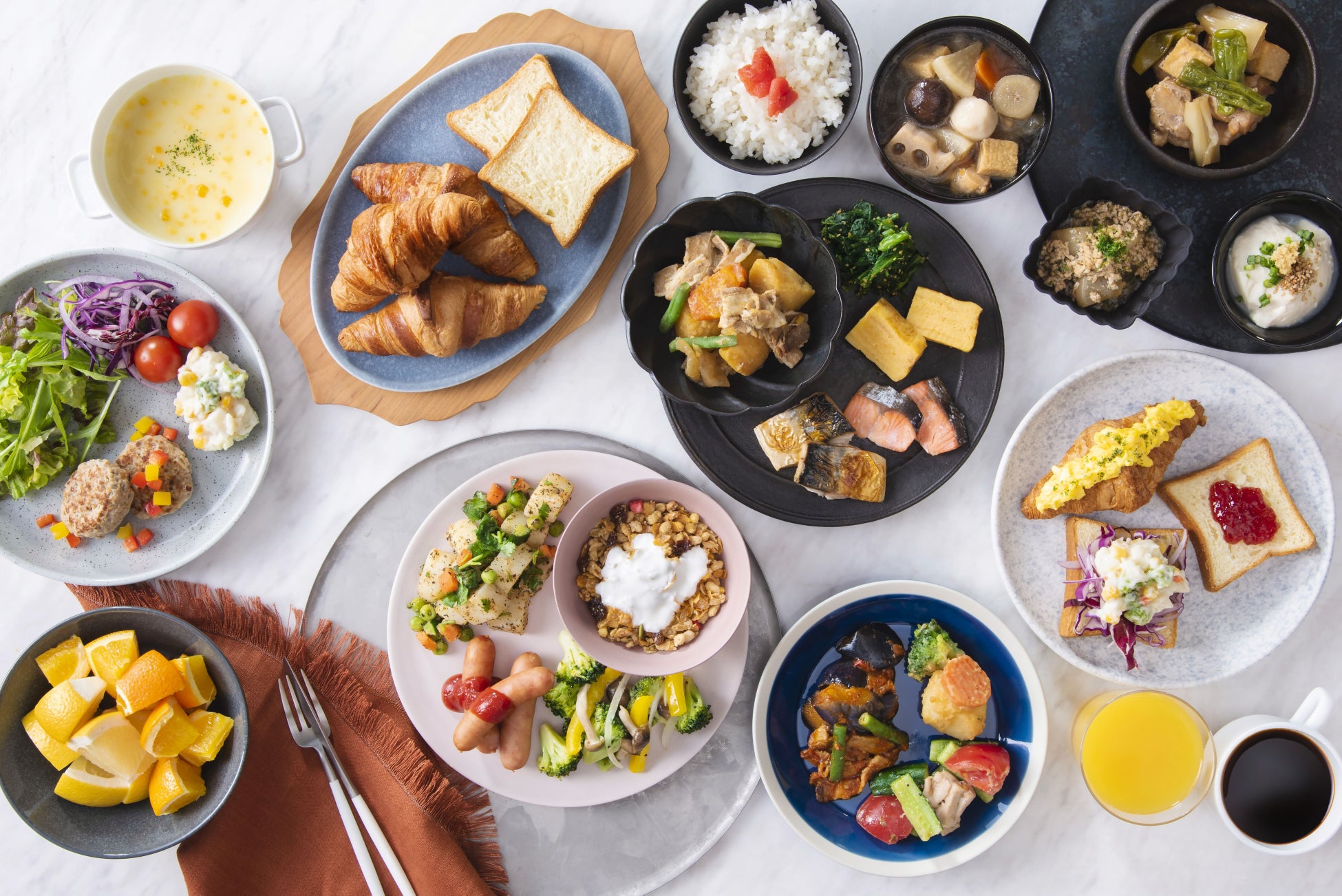 カンデオホテルズの朝食は、全国から届く旬の食材を取り入れ、手づくりにこだわったビュッフェスタイルで提供しています。日本古来の食文化である“食べ合わせ”を意識した約60種類以上のメニューから、その日の気分や体調に合わせて自由に組み合わせて楽しむことができます。メニューは日替わりのため、連泊でも毎回異なる朝食を楽しめます。
