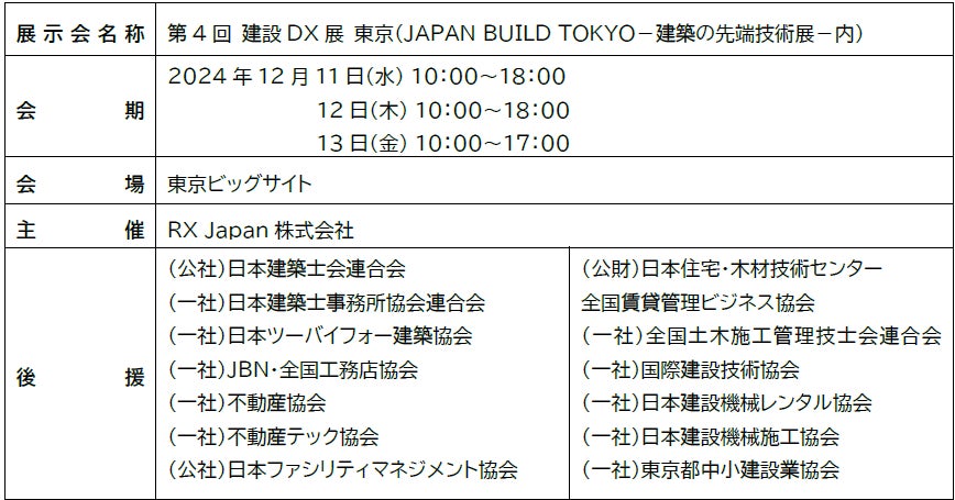 総合建設機械レンタルの株式会社アクティオ(本社:東京都中央区日本橋、代表取締役社長兼COO:小沼直人、以下アクティオ)は、2024年12月11日(水)~13日(金)の3日間、東京ビッグサイトで開催される建設業のDXが一堂に会する「第4回 建設DX展 東京」に出展いたします。本展は、日本最大級の建築展「JAPAN BUILD TOKYO-建築の先端技術展-」内で開催されます。