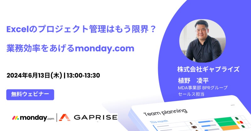 デジタルビジネス支援を行う、海外SaaS商社の株式会社ギャプライズ(本社:東京都千代田区、代表取締役 CEO:甲斐 亮之、以下「当社」)は、6月13日(木)13時より、「Excelでのプロジェクト管理はもう限界?!チームの業務効率を上げるmonday.com活用法」と題しましたオンラインセミナーを開催する事をお知らせいたします。