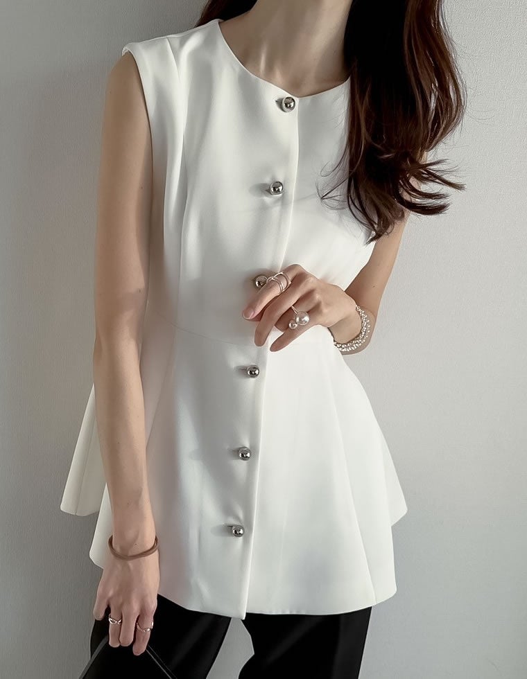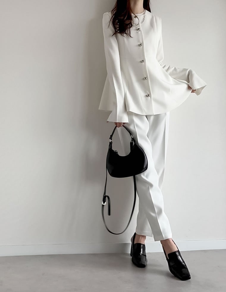 シンプルコーデを華やかに見せるフェミニンなペプラムシルエットに、モードな印象のメタルボタンをプラスしました。