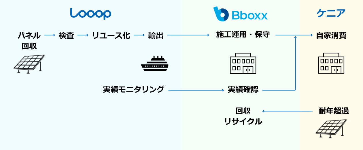 「エネルギーフリー社会の実現」をビジョンに掲げ、エネルギーと暮らしの新しいあり方を追求する株式会社Looop(本社:東京都台東区、代表取締役社長 CEO:中村創一郎、以下「Looop」)は、アフリカでエネルギー事業を展開するBboxx Kenya Ltd(本社:ケニア、以下「Bboxxケニア社」)と、ケニアの電気が届かない地域(以下 未電化地域)における太陽光パネルリユース(再利用)の実証実験に向けた基本合意書(MOU)を締結しました。本取り組みは、国内で役目を終えた太陽光パネルが急増する「2030年問題」への有効な解決策を提示するとともに、使われなくなった資源を新たな価値へと転換し、未電化地域にクリーンエネルギーを広げていく挑戦です。