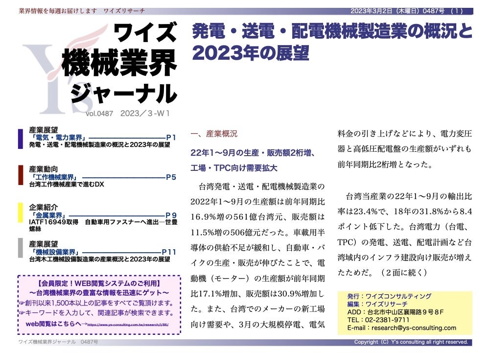 【台湾情報】発電・送電・配電機械製造業の概況と2023年の展望<ワイズ機械業界ジャーナル2023年3月第1週号発行>