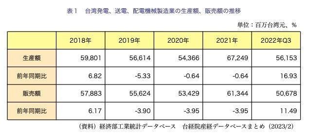 台湾発電・送電・配電機械製造業の2022年1~9月の生産額は前年同期比16.9%増の561億台湾元、販売額は11.5%増の506億元だった。車載用半導体の供給不足が緩和し、自動車・バイクの生産・販売が伸びたことで、電動機(モーター)の生産額が前年同期比17.1%増加、販売額は30.9%増加した。また、台湾でのメーカーの新工場向け需要や、3月の大規模停電、電気料金の引き上げなどにより、電力変圧器と高低圧配電盤の生産額がいずれも前年同期比2桁増となった。