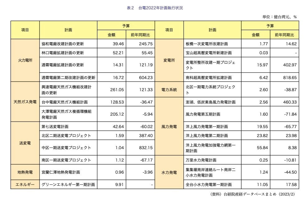 TPCの22年の発電、送電、配電計画26項目のうち、台中発電所(台中市)の設備更新計画は設備投資のピークが過ぎ、第7送電・変電計画と洋上(オフショア)、陸上風力発電施設の工事も完了したため、TPCの22年予算は21年を下回っている。ただ、温室効果ガスの排出削減に向けた▽通霄発電所(苗栗県)、▽興達発電所(高雄市)、▽協和発電所(基隆市中山区)での天然ガス(LNG)火力発電機の増設計画や、第2期洋上風力発電計画、地熱、水力発電計画、電力網整備計画などは今後も進められるため、台湾当産業の各企業はTPC向けの設備需要が期待できる。(中略)