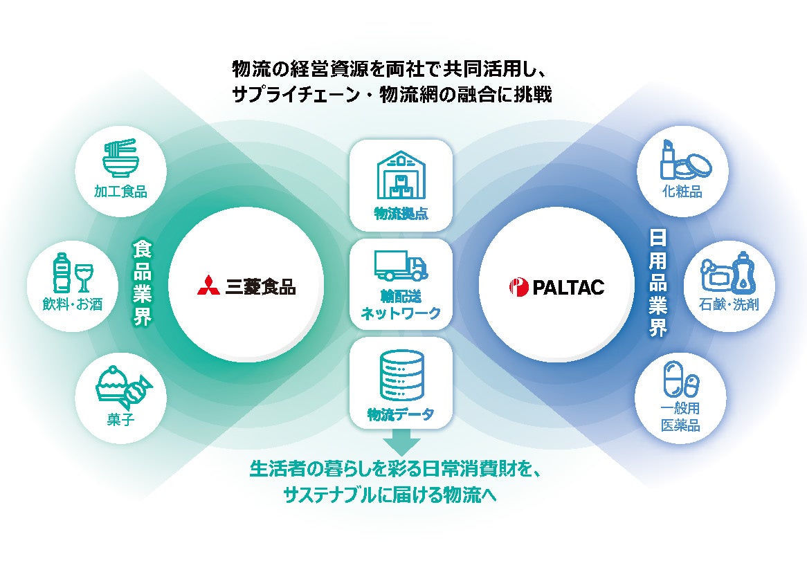 三菱食品は食品業界の中間流通におけるリーディングカンパニーとして、またPALTACは、化粧品・日用品、一般用医薬品(以下「日用品等」)業界の中間流通におけるリーディングカンパニーとして事業展開しております。それぞれ業界は異なるものの、ドラッグストア・コンビニエンスストア・スーパーマーケットなどの小売業様との間で商流・物流を担い、互いに全国規模で事業を展開していることから同一の販売先も多く存在しております。しかしながら、これまでの流通においては「食品」と「日用品等」とでは、異なるサプライチェーン・物流網が構築されており、同一の小売業様の物流拠点や店舗に対しても、別々に商品を届けることが業界の常識となっていました。