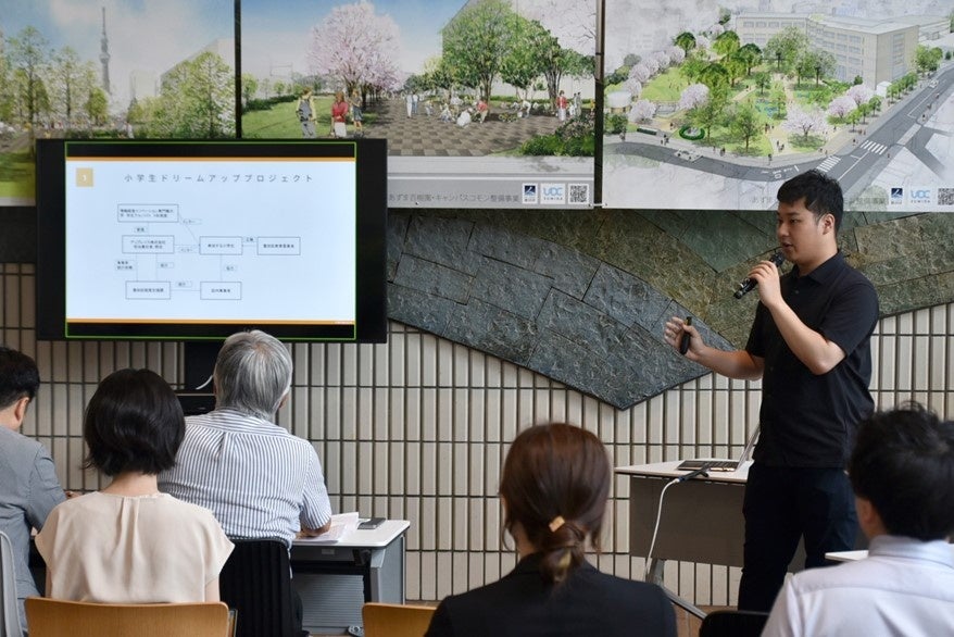 今年度より区内学生枠が設けられ、応募した10社のうち、一次審査を通過した墨田区内の大学に通う学生が起ち上げた企業3社によるピッチコンテストが実施されました。各社墨田区の抱える問題を解決するための実証実験の事業計画を発表し、iU生が起業した「アップレイス株式会社」「Lupinus合同会社」の2社が優秀賞を受賞しました。