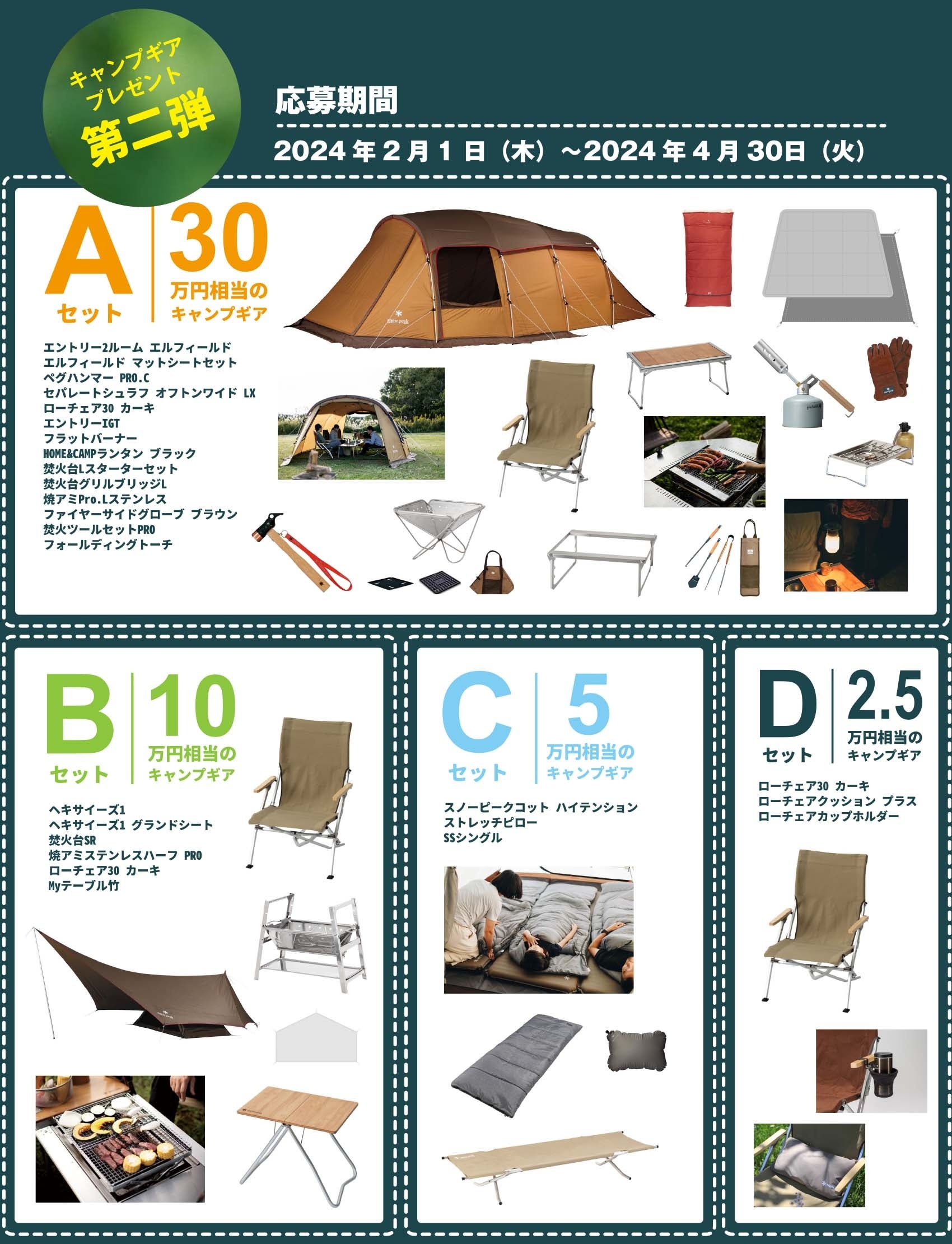 【キャンペーン内容】: 応募された方から抽選で4名様に最高30万円相当のキャンプギアプレゼント
