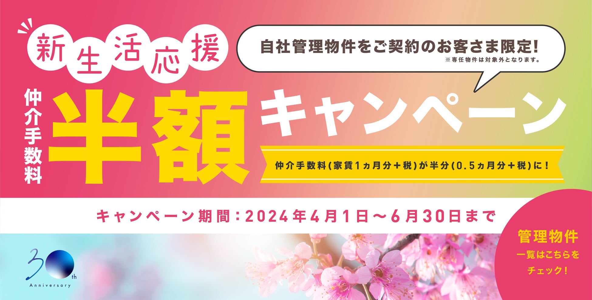 【仲介手数料半額キャンペーン!!】三和エステート創業30周年の感謝企画第6弾は新生活応援!