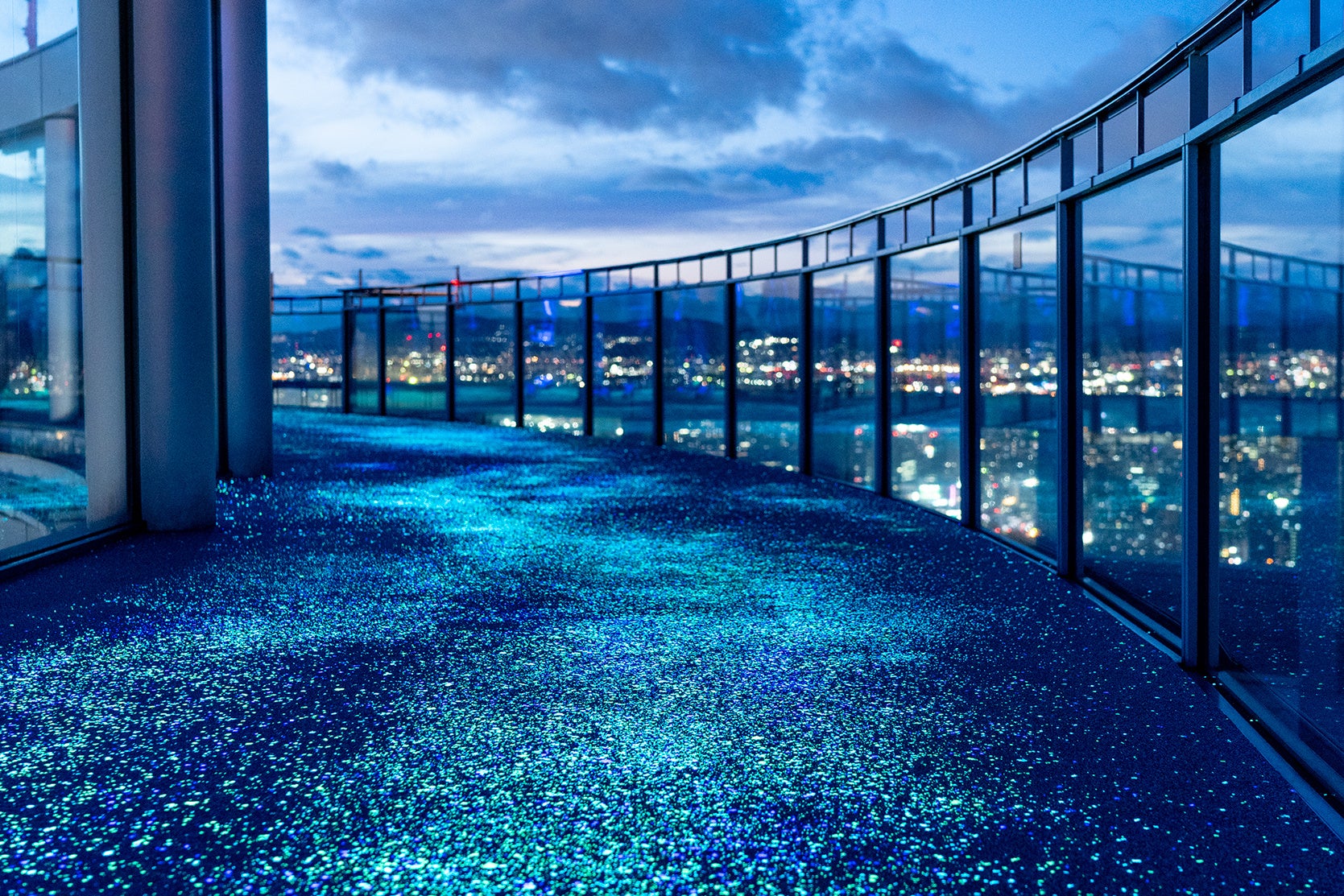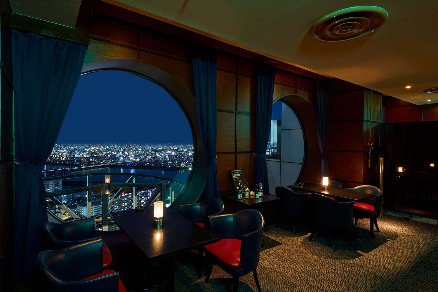 大きな丸窓の奥に広がる宝石のような眺望とともに