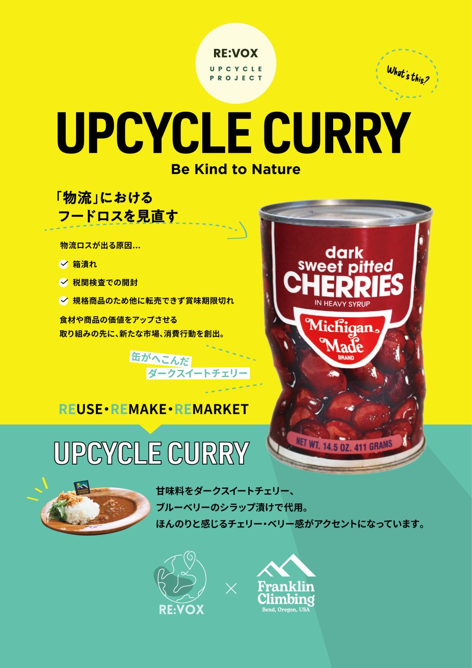ハウス食品グループに属するヴォークスが推進する食のアップサイクルプロジェクト【RE:VOX】、そのプロジェクト内の”物流”におけるフードロスを削減する目的で作られたアップサイクルカレーになります。甘味料のダークスイートチェリーは、輸送時の箱潰れ/缶へこみによる規格外商品を活用しました。