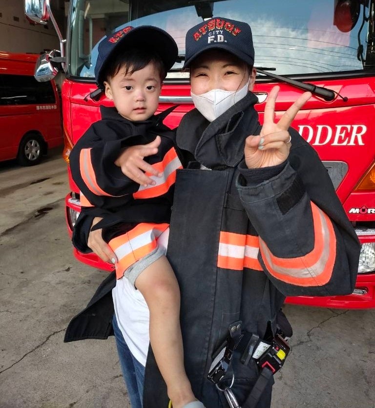 お子さま用の防火服を羽織ってちびっこ消防士になりきり、消防士さんと記念撮影ができます。