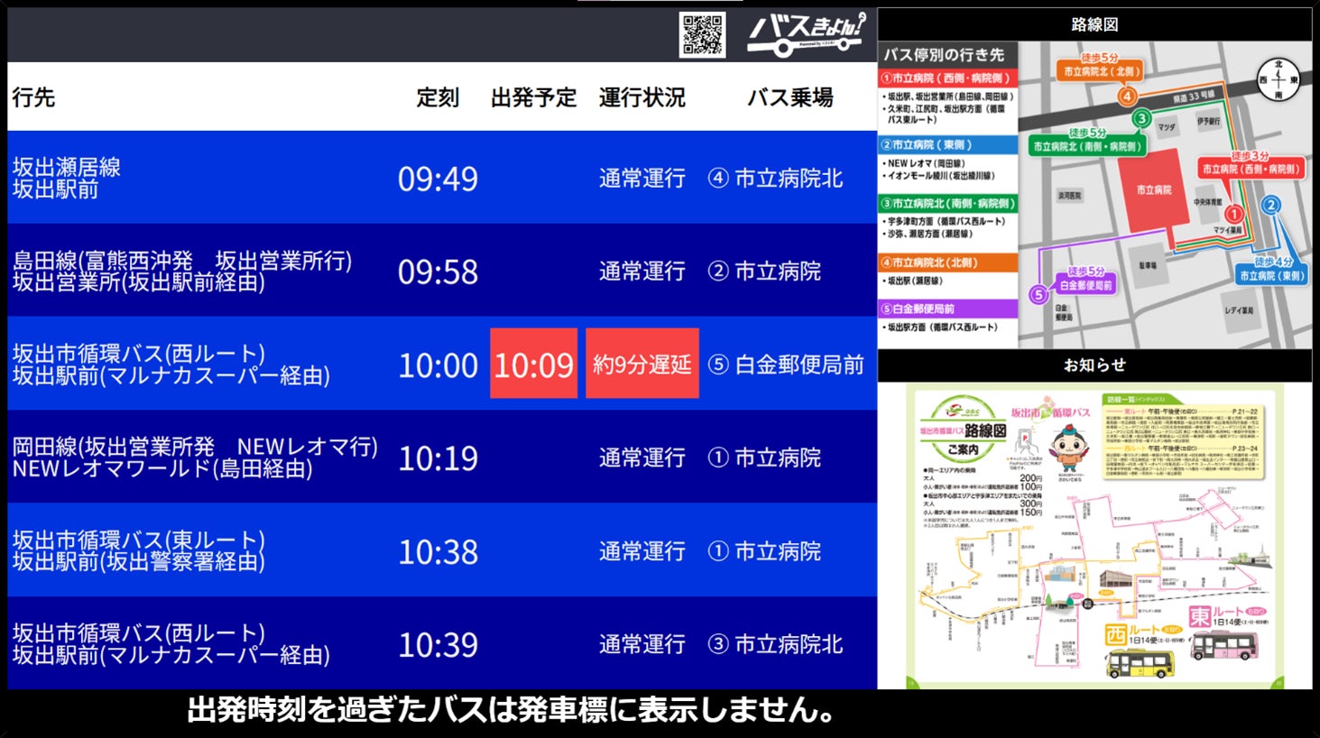 また、坂出市立病院では、周辺に複数のバス停が混在するなかで、それらすべてのバス停への路線バス接近情報をまとめて表示することで、病院周辺の公共交通の利便性を、来院者に効果的にPRします。