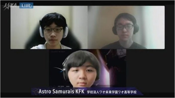 「きぼう」ロボットプログラミング競技会(Kibo-RPC、6月)には、ワオ高校2、3年生の3人でつくるチーム「Astro Samurais KFK」が出場しました。この競技会は、国際宇宙ステーション・「きぼう」日本実験棟での競技に出場するチームを決める日本国内の予選大会です。宇宙飛行士をサポートする船内ドローンを操るプログラムを組み、その正確さなどを競う内容となっています。今回の予選会では、「きぼう」内を模したシミュレータを使い、画像認識プログラムでいかに目的のアイテムを速く正確に発見できるかを競いました。「Astro Samurais KFK」の3人は、オンラインでミーティングを重ねてプログラムを完成させ、競技に挑みました。対戦相手の多くは大学生。ハイレベルな戦いとなり、残念ながら上位入賞はかないませんでしたが、メンバーは「来年も新しい仲間を募って挑戦したい」と意欲を燃やしています。