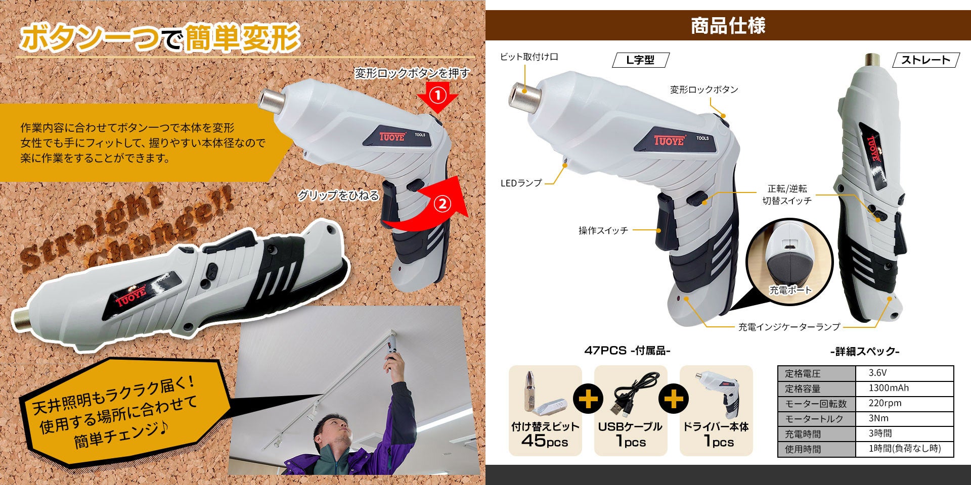 本体・USB充電ケーブルに加え、家具の組み立てや小さな修理に必要なビットが45個も付属しており、届いたその日からすぐに使えます。