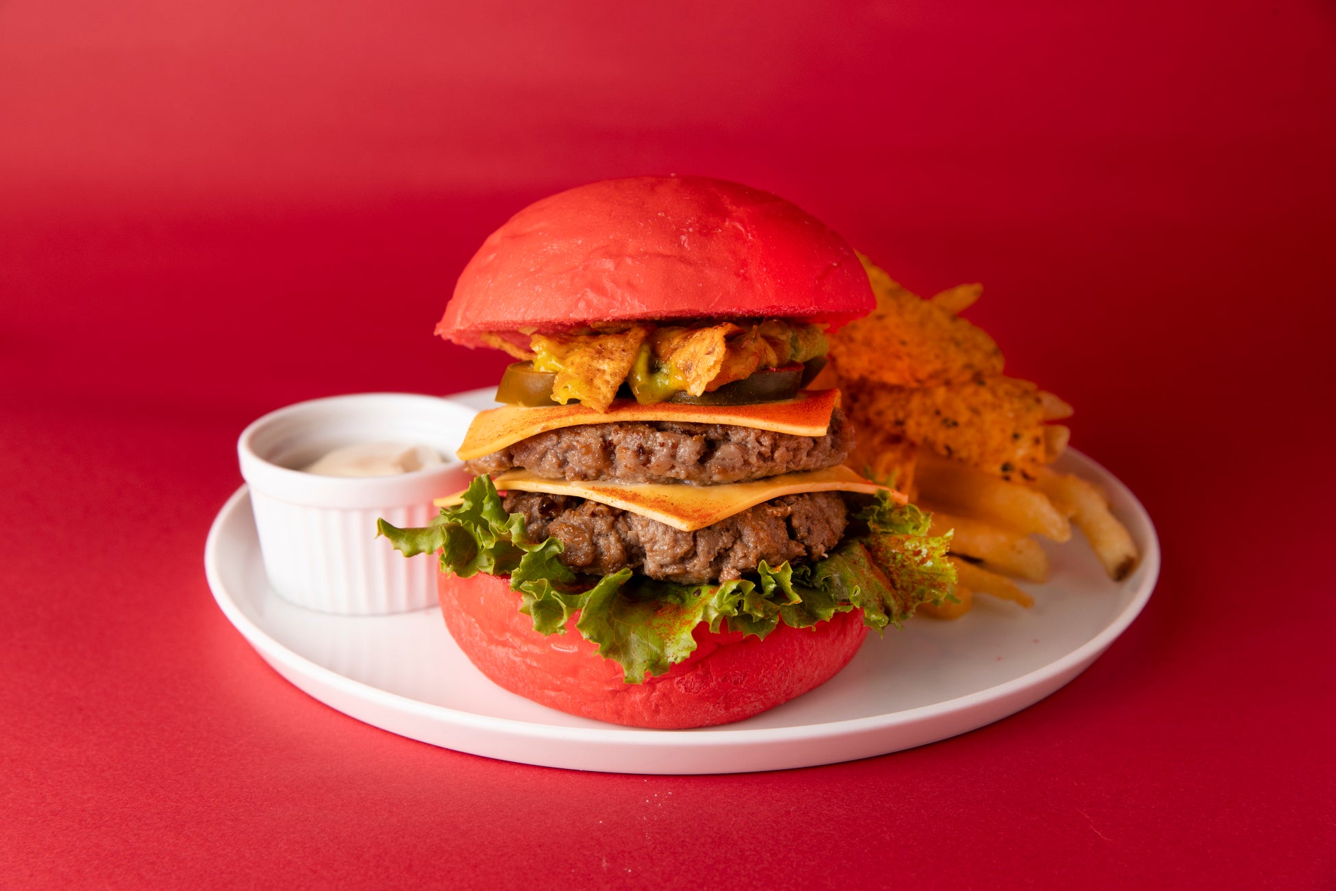 辻選手のメキシコ修行と力強いファイトスタイルを表現。情熱的でスパイシー、肉厚のパティを2枚豪快に挟んだ王者の風格漂うバーガーです。