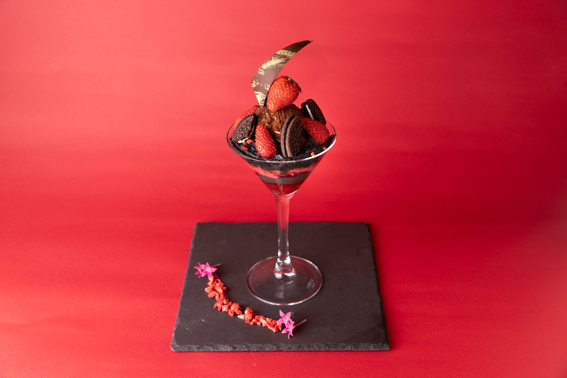 力強くも色気のあるヒロム選手をイメージしたパフェ。黒と赤で特徴に、チョコレートやココアの甘さをベリーの酸味が際立たせます。