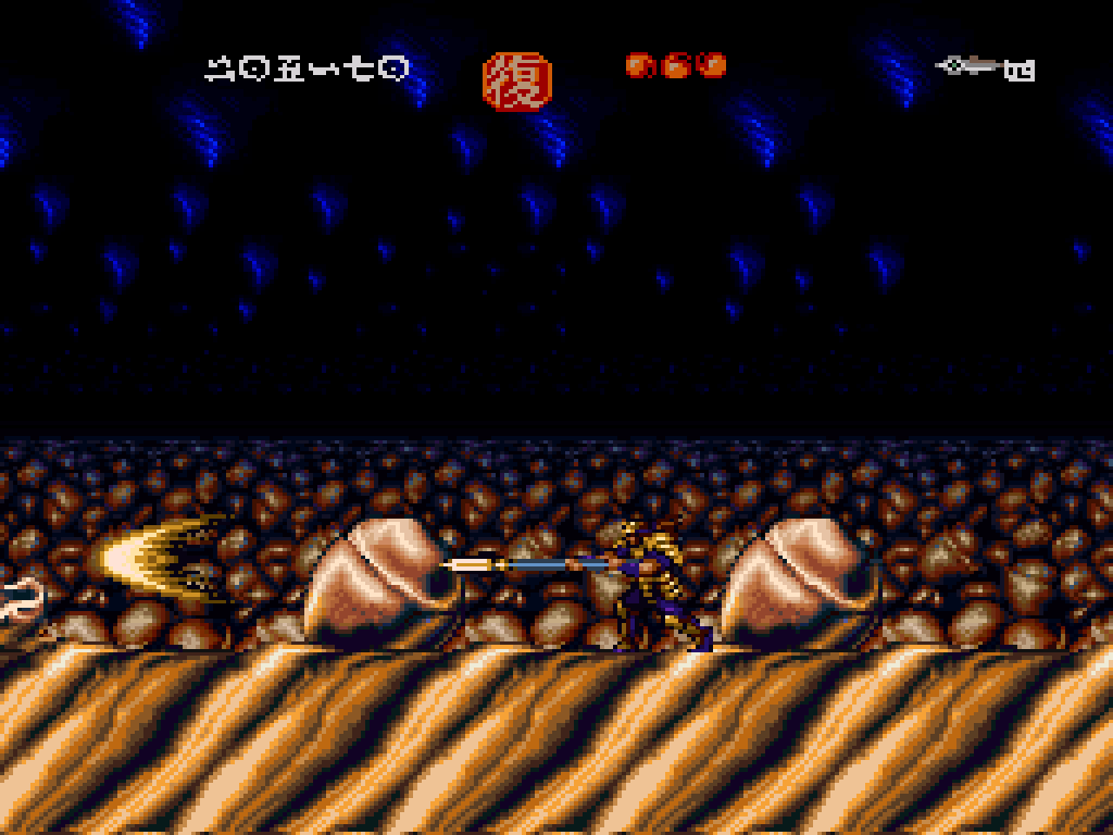 本作は1992年にリリースされたサイドビューのアクションゲーム。プレイヤーは旅の武士・神雷を操作して、さらわれた娘を救出するため全8ステージの魍魎洞を攻略することになります。
