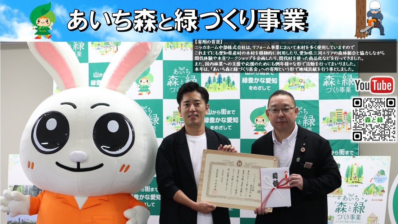 2023年:「あいち森と緑づくり基金」へ寄附を実施。森林整備や環境保全活動を支援し、愛知県より感謝状を授与されました。