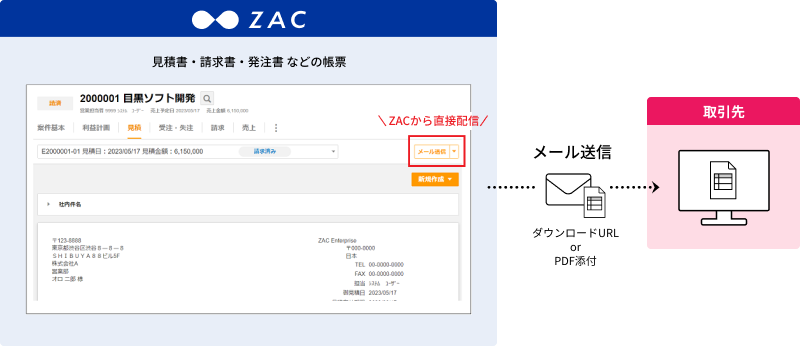 ZACで作成した「見積書・請求書・発注書」などの帳票を、システム上で取引先にメールで直接配信できるようになりました。