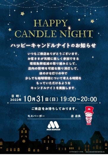 モスバーガーを展開する株式会社モスフードサービス(代表取締役社長:中村 栄輔、本社:東京都品川区)では、2022年10月31日(月)、東京と九州のモスバーガー18店舗にて、SDGs、節電活動の一環として「ハッピーキャンドルナイト」を行います。店内照明に低消費電力型のLEDキャンドルを使用し、普段と異なる雰囲気の店内で「ハロウィンの日」を楽しんでいただくイベントです。