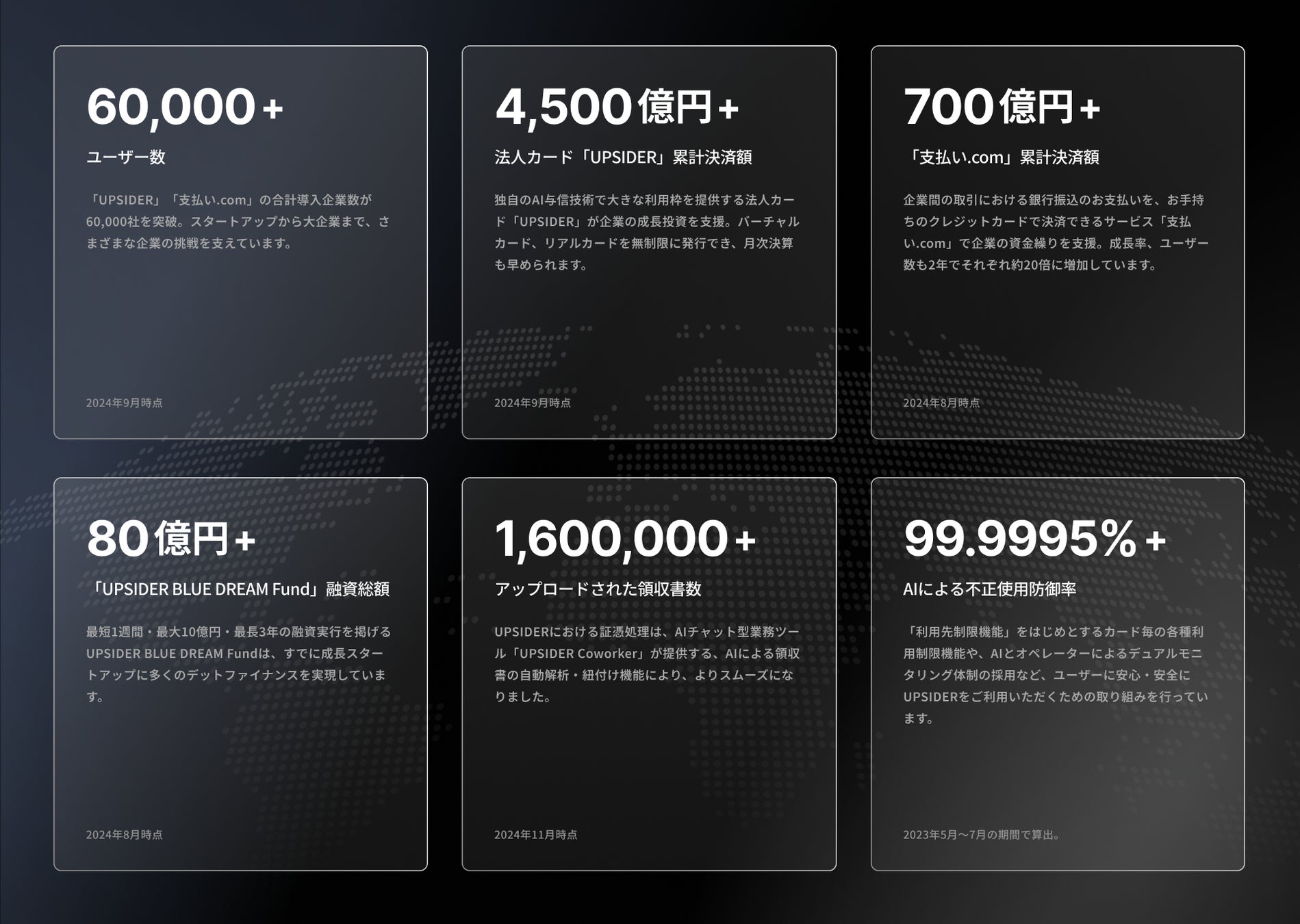 シリーズCのクローズ(2022年3月)から約2年半の間、これまで調達した資金を事業に積極的に投下しながら、現場では目の前のユーザーに徹底的に伴走した結果、既存事業「UPSIDER」「支払い.com」の合計導入企業数は約1,200社*1 から60,000社(50.0倍)*2、「UPSIDER」決済額は約190億円から4,500億円(23.7倍)*2、当時リリース前だった「支払い.com」の累計決済額は700億円超え*3と大きく成長いたしました。