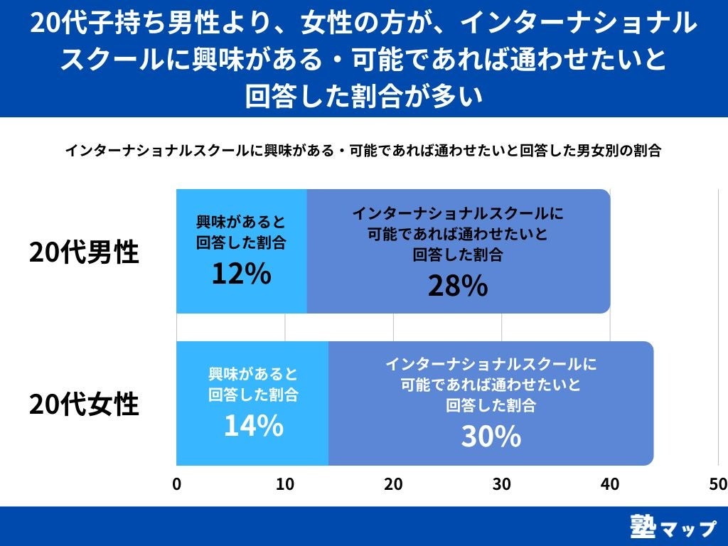 20代子持ち女性の方が、男性よりもインターナショナルスクールに興味を持っており、経済面や距離の面で可能なら通わせたいと考えているようです。
