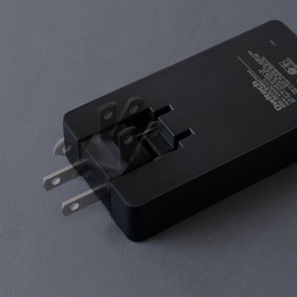 プラグが180度動くため、コンセントや電源タップに挿しても、隣合ったプラグに干渉しにくい仕様です。また、プラグ部分を折りたためばバッグの内ポケットに入れても飛び出しません。