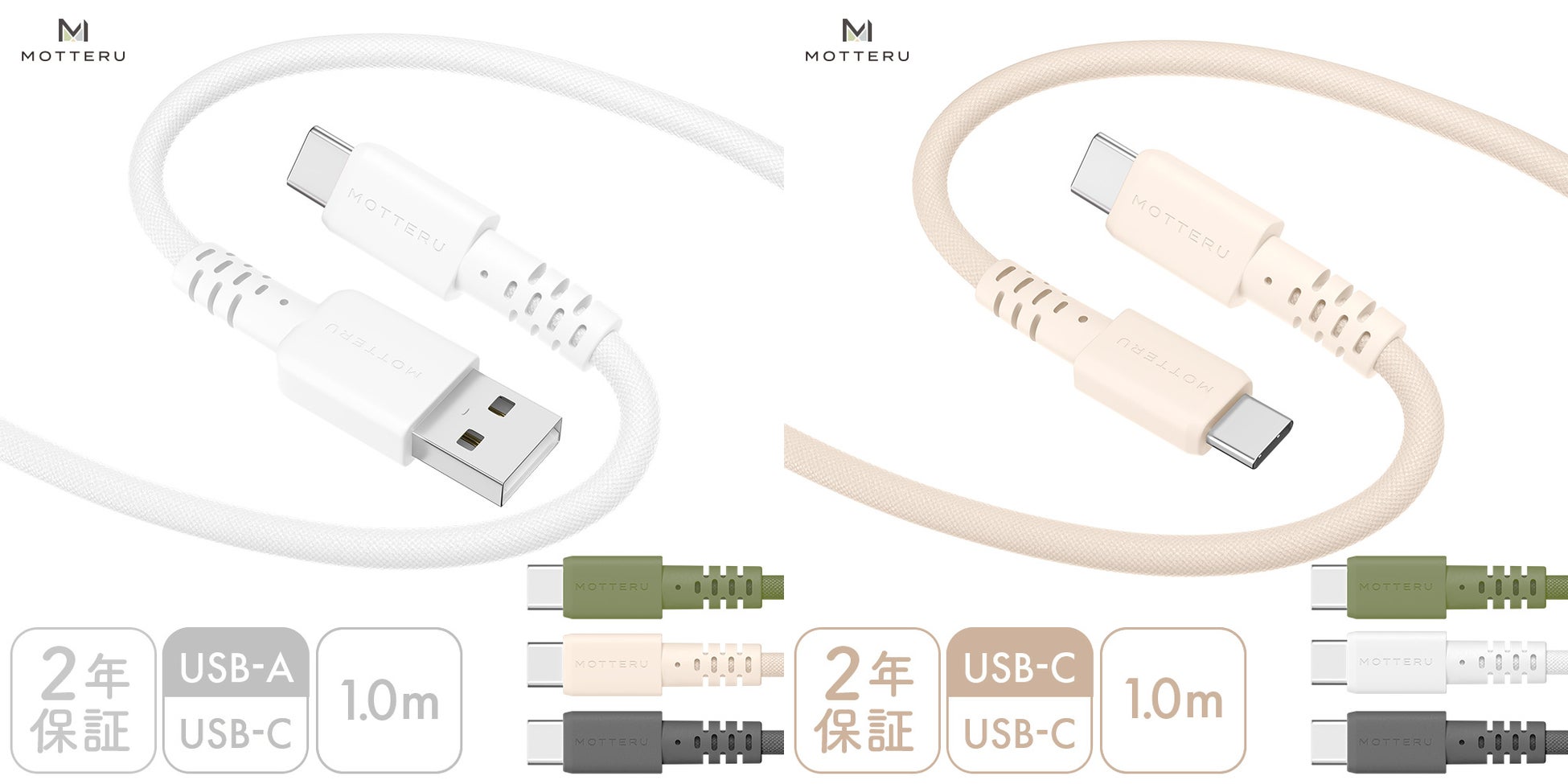 株式会社MOTTERU(モッテル)(本社:神奈川県海老名市、代表取締役:櫻田良太)は、編み込みデザインのケーブルにカーキとミルクコーヒーの2色を追加。長さは使いやすい100㎝でUSB-A to USB-C / USB-C to USB-Cの2種から、用途に合わせてお選びください。